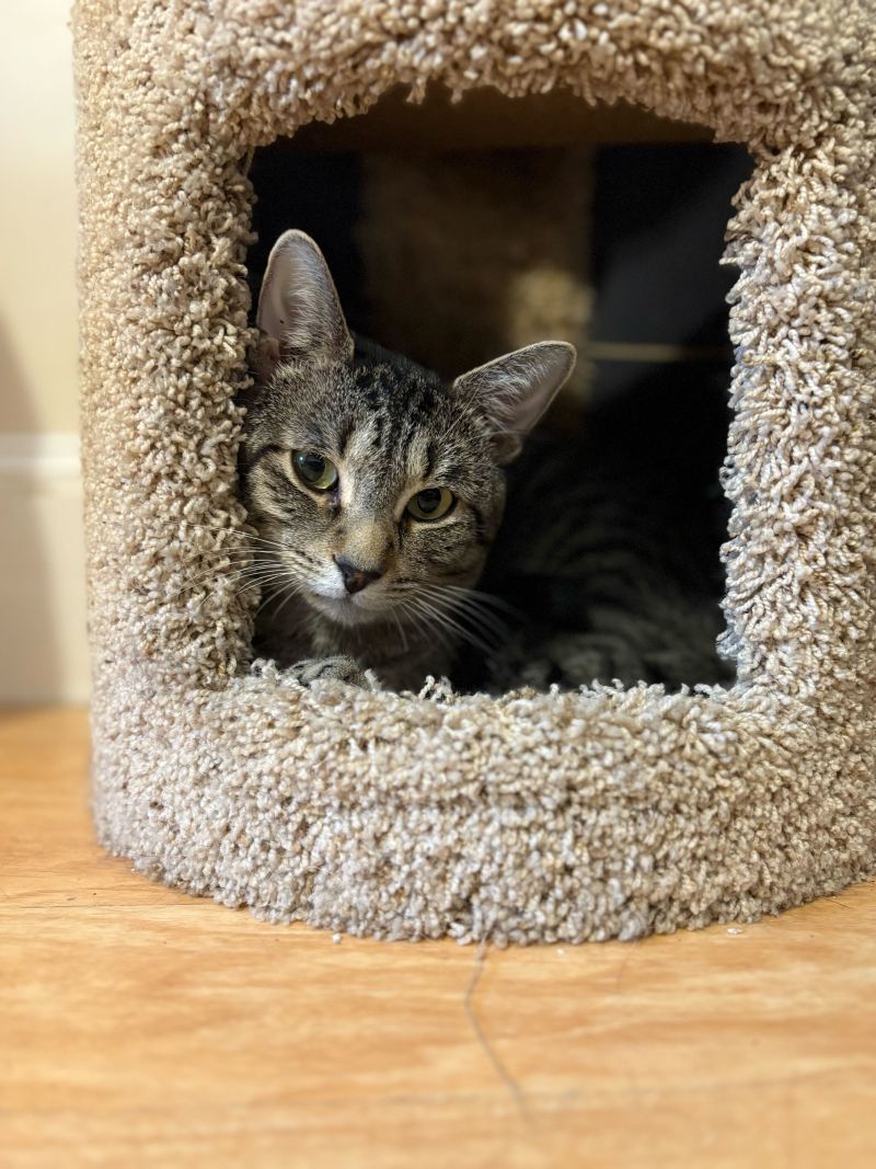 He is a petite tabby full of energy. He is shy at first, but once he feels comfortable, he seeks belly rubs and play time. He is a master of intrusive thoughts and gets into places he should not be! He doesn’t seem to mind other cats, and he is young enough to be trained to cohabit with dogs.