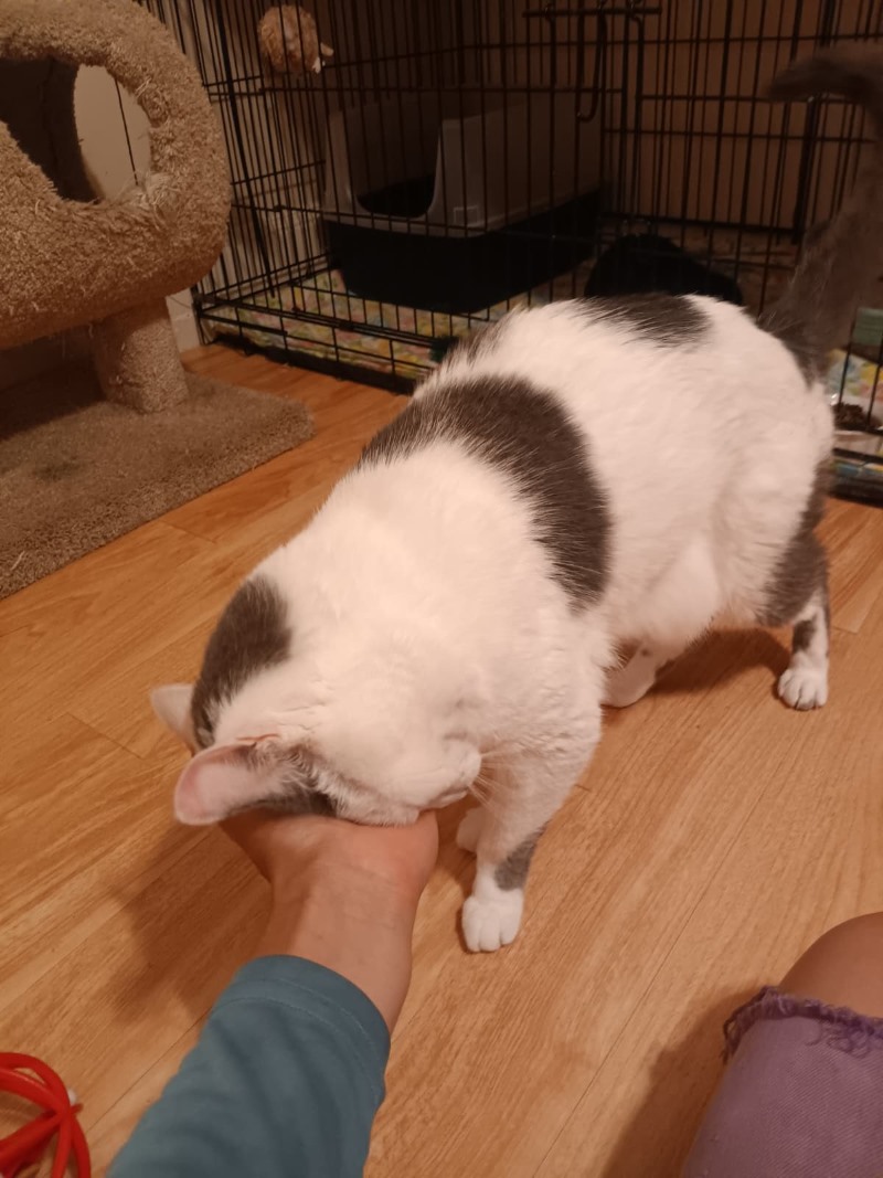 She’s around 4–5 years old, spayed, and absolutely lovely. Honey Bun is independent but affectionate – she won’t smother you, but she will seek you out for gentle pets and cozy company when she’s feeling relaxed.