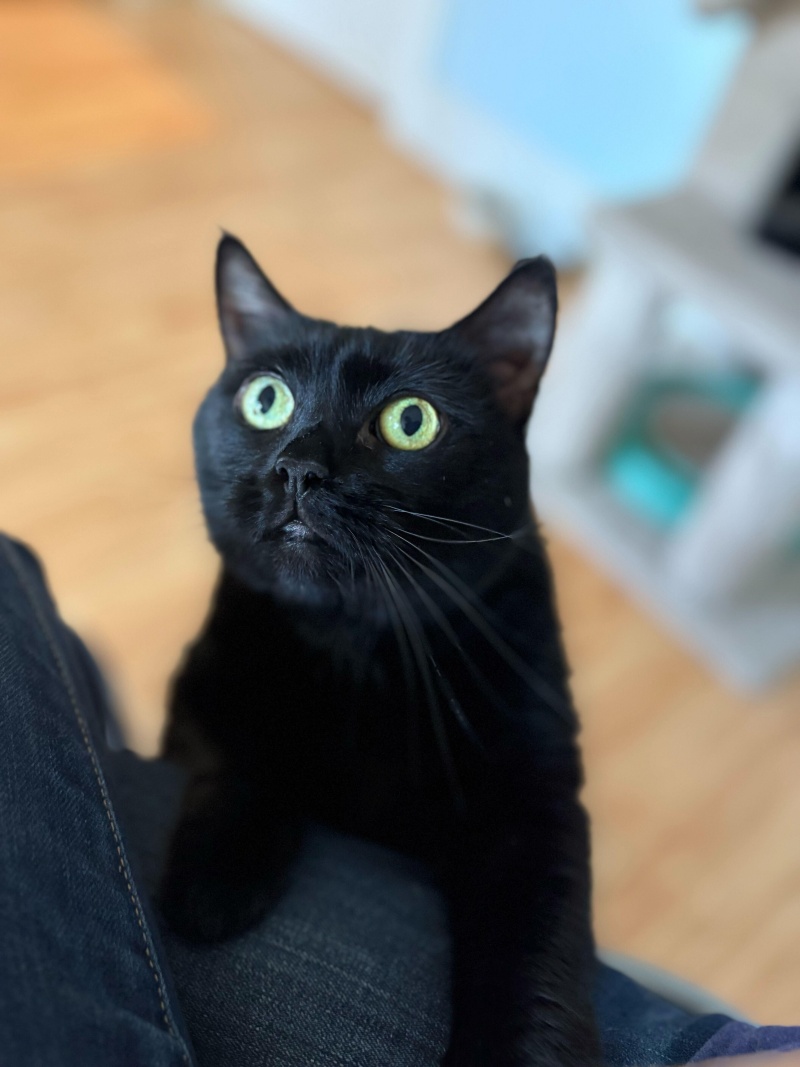 Star and her siblings were recently brought to us from a lady who loved them, but made the hard decision of letting go. We want to honor her wishes by finding a home where Star can grow up to be the elegant void all black cat truly are. Baby Star was born breech and has some extra curves in her hind legs. That doesn’t stop her from been a kitten and be really playful. It is barely noticeable.