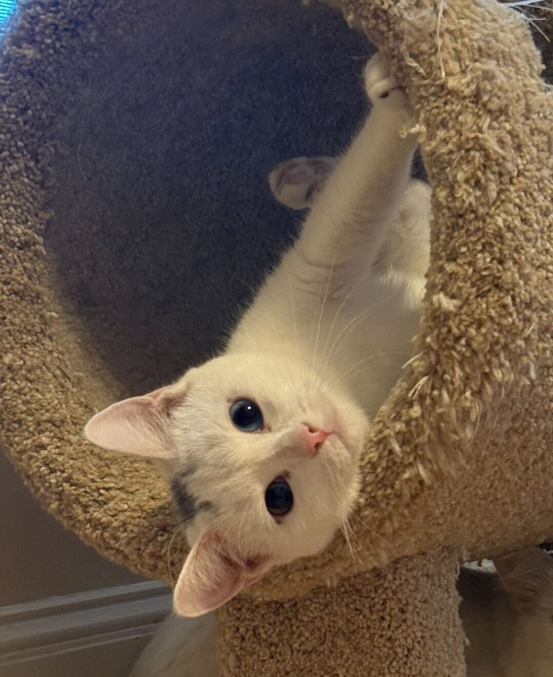 Dusty is a barn cat that has grown to love humans and being around them is her goal. She likes to climb climb climb! She enjoys sprinting, going vertical, reach high places and get in trouble for doing so!